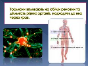 Гормони впливають на обмін речовин та діяльність різних органів, надходячи до них через кров.