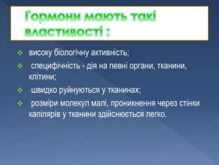 Гормони мають такі властивості :високу біологічну активність; специфічність - дія на певні органи, тканини, клітини; швидко руйнуються у тканинах; розміри молекул малі, проникнення через стінки капілярів у тканини здійснюється легко.