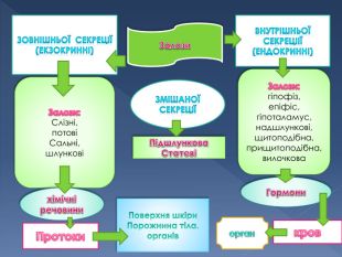 Залози. Внутрішньої секреціії(ендокринні)Зовнішньої секреції(екзокринні)Змішаної секреціїЗалози:гіпофіз,епіфіс,гіпоталамус,надшлункові,щитоподібна,прищитоподібна,вилочкова. Залози: Слізні,потовіСальні,шлунковіПідшлункова. Статевіхімічні речовини. Гормони. Протокикроворган. Поверхня шкіри. Порожнина тіла. органів