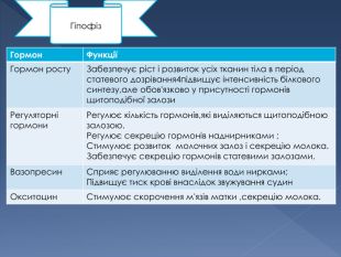 {00 A15 C55-8517-42 AA-B614-E9 B94910 E393}Гормон. ФункціїГормон росту. Забезпечує ріст і розвиток усіх тканин тіла в період статевого дозрівання4підвищує інтенсивність білкового синтезу,але обов'язково у присутності гормонів щитоподібної залози. Регуляторні гормони. Регулює кількість гормонів,які виділяються щитоподібною залозою. Регулює секрецію гормонів наднирниками ; Стимулює розвиток молочних залоз і секрецію молока. Забезпечує секрецію гормонів статевими залозами. Вазопресин. Сприяє регулюванню виділення води нирками;Підвищує тиск крові внаслідок звужування судин. Окситоцин. Стимулює скорочення м'язів матки ,секрецію молока. Гіпофіз
