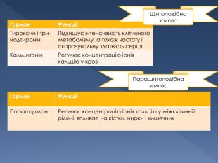 {F5 AB1 C69-6 EDB-4 FF4-983 F-18 BD219 EF322}Гормон. ФункціїТироксин і три-йодтиронін. Підвищує інтенсивність клітинного метаболізму, а також частоту і скорочувальну здатність серця. Кальцитонін. Регулює концентрацію іонів кальцію у крові{F5 AB1 C69-6 EDB-4 FF4-983 F-18 BD219 EF322}Гормон. ФункціїПаратгормон. Регулює концентрацію іонів кальцію у міжклітинній рідині, впливає на кістки, нирки і кишечник. Щитоподібна залоза. Паращитоподібна залоза