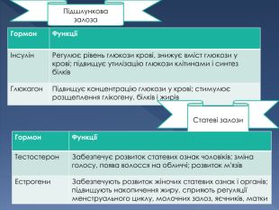 {93296810-A885-4 BE3-A3 E7-6 D5 BEEA58 F35}Гормон. ФункціїІнсулін. Регулює рівень глюкози крові, знижує вміст глюкози у крові; підвищує утилізацію глюкози клітинами і синтез білків. Глюкагон. Підвищує концентрацію глюкози у крові; стимулює розщеплення глікогену, білків і жирів. Підшлункова залоза. Статеві залози{93296810-A885-4 BE3-A3 E7-6 D5 BEEA58 F35}Гормон. ФункціїТестостерон. Забезпечує розвиток статевих ознак чоловіків; зміна голосу, поява волосся на обличчі; розвиток м'язів. Естрогени. Забезпечують розвиток жіночих статевих ознак і органів; підвищують накопичення жиру, сприяють регуляції менструального циклу, молочних залоз, яєчників, матки
