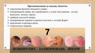 Протипоказання до масажу обличчя:порушення функції лицьового нерва;захворювання шкіри, які перебувають у стадії загострення - до них відносять: екзему, герпес;грибкові патології шкіри;захворювання серцево-судинної системи у гострій формі;порушення згортання крові;гіпертонічна хвороба.