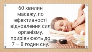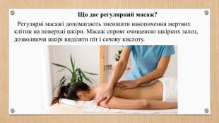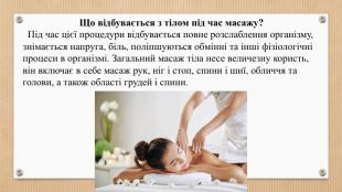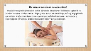 Як масаж впливає на організм? Масаж стимулює кровообіг, обмін речовин, забезпечує живлення органів та тканин киснем, тонізує м'язи. За рахунок цього він активізує роботу внутрішніх органів та лімфатичної системи, прискорює обмінні процеси, допомагає у відновленні організму, сприяє психологічному розслабленню.