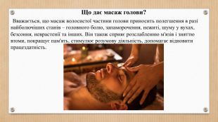 Що дає масаж голови? Вважається, що масаж волосистої частини голови приносить полегшення в разі найболючіших станів – головного болю, запаморочення, нежиті, шуму у вухах, безсоння, неврастенії та інших. Він також сприяє розслабленню м'язів і зняттю втоми, покращує пам'ять, стимулює розумову діяльність, допомагає відновити працездатність.