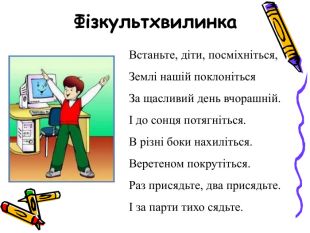 Фізкультхвилинка. Встаньте, діти, посміхніться, Землі нашій поклоніться За щасливий день вчорашній. І до сонця потягніться. В різні боки нахиліться. Веретеном покрутіться. Раз присядьте, два присядьте. І за парти тихо сядьте.