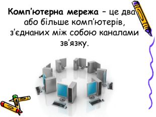 Комп’ютерна мережа – це два або більше комп’ютерів, з’єднаних між собою каналами зв’язку.
