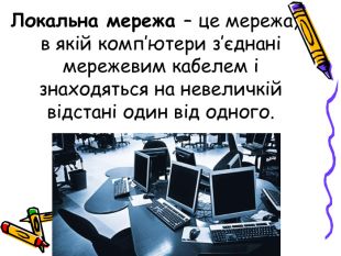 Локальна мережа – це мережа, в якій комп’ютери з’єднані мережевим кабелем і знаходяться на невеличкій відстані один від одного.