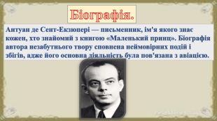 Презентація на тему: «Сент-Екзюпері, Антуан де». Презентація складається з 7 слайдів, біографія розповідає нам про незабутні події письменника, на 3 слайді розповідається про дитинство та юність - письменник мав в дитинстві інше ім'я, він був третьою дитиною з п'ятьох, на 4 слайді вставлене відео на тему: «Авіакатастрофа Сенс-Еклюпері,ь Антуан де» - 31 липня 1944 року письменник сів і свій літак вирушив в бойовий політ і не повернувся і на 6 слайді вставлені цікаві факти про письменника.