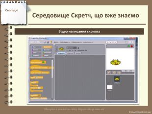 Сьогодніhttp://vsimppt.com.ua/http://vsimppt.com.ua/Середовище Скретч, що вже знаємо. Опис можливостей скриптів – Блок руху. Змінює напрямок спрайта на вказаний (угору, униз, праворуч, ліворуч). Зміна напрямку відбувається шляхом вибору його зі списку. Розкриття списку здійснюється натисненням на чорний трикутник