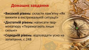 Презентація до уроку на тему: "Сильний людський характер в екстремальній ситуації" (за оповіданням Джека Лондона «Любов до життя») містить вправи, які допоможуть учням навчитись аналізувати зміст оповідання, давати характеристику героям твору; розвивати усне зв’язне мовлення; виховувати в учнів мужність, сміливість, вірність у дружбі, гуманне ставлення до людей.