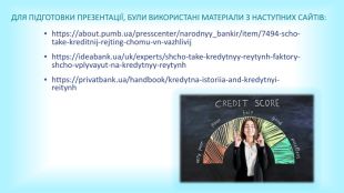 Для підготовки презентації, були використані матеріали з наступних сайтів:https://about.pumb.ua/presscenter/narodnyy_bankir/item/7494-scho-take-kreditnij-rejting-chomu-vn-vazhlivijhttps://ideabank.ua/uk/experts/shcho-take-kredytnyy-reytynh-faktory-shcho-vplyvayut-na-kredytnyy-reytynhhttps://privatbank.ua/handbook/kredytna-istoriia-and-kredytnyi-reitynh