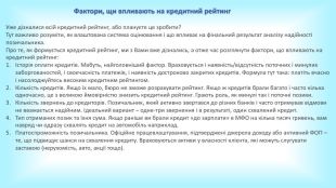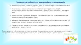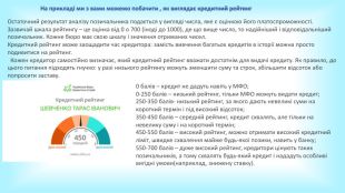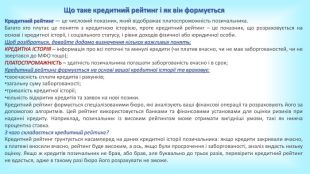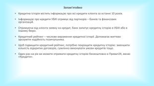 Запамʼятаймо. Кредитна історія містить інформацію про всі кредити клієнта за останні 10 років.Інформацію про кредити УБКІ отримує від партнерів – банків та фінансових організацій. Отримуючи від клієнта заявку на кредит, банк запитує кредитну історію в УБКІ або в іншому бюро. Кредитний рейтинг – числове вираження кредитної історії. Допомагає миттєво зрозуміти надійність позичальника. Щоб підвищити кредитний рейтинг, потрібно покращити кредитну історію: зменшити кількість відкритих договорів, сумлінно виконувати умови кредитів тощо. Один раз на рік ви можете отримати кредитну історію безкоштовно в Приват24, меню «Кредити».