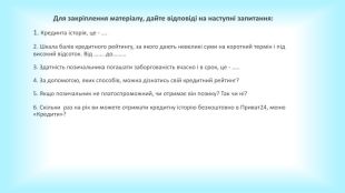 Для закріплення матеріалу, дайте відповіді на наступні запитання:1. Крединта історія, це - ….2. Шкала балів кредитного рейтингу, за якого дають невеликі суми на короткий термін і під високий відсоток. Від ……. до………3. Здатність позичальника погашати заборгованість вчасно і в срок, це - …..4. За допомогою, яких способів, можна дізнатись свій кредитний рейтинг?5. Якщо позичальник не платоспроможний, чи отримає він позику? Так чи ні?6. Скільки раз на рік ви можете отримати кредитну історію безкоштовно в Приват24, меню «Кредити»?