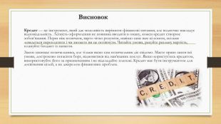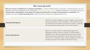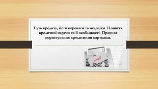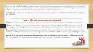 Суть кредиту — це надання коштів банком чи фінустановою позичальнику на певний строк із зобов'язанням повернути їх із відсотками. Час від часу нам потрібні гроші для покриття наших потреб. У такі моменти на допомогу може прийти кредит. Фінансовий інструмент, який дозволяє швидко вирішити матеріальні питання або реалізувати великі покупки. У цій презентації ми з вамми розглянемо, що таке кредит, які бувають його види, а також його переваги та недоліки.І так…. Що таке кредит простими словами?Кредит — це фінансова домовленість, згідно з якою одна сторона (кредитор) передає іншій (позичальнику) гроші або інші ресурси на певний період з умовою повернення і, майже завжди, сплати відсотків за користування. Але є винятки. Якщо простіше, то ви отримуєте певну суму зараз, а повертаєте пізніше трохи більше, ніж взяли. Наприклад, якщо взяти 10 000 грн під 20% річних, через рік доведеться повернути близько 12 000 грн (10 000 основного боргу + 2 000 грн відсотків). Важливо те, що кредит може надаватися не лише грошима, а інколи це товар у розстрочку або послуга з відкладеною оплатою. Але в усіх випадках суть одна: тимчасове користування чужими коштами з подальшим поверненням. Кредит - це гроші, які вам позичає фінансова установа з умовою, що ви повернете ці гроші пізніше разом з процентами