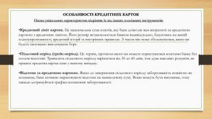 Особливості кредитних карток. Низка унікальних характеристик відрізняє їх від інших платіжних інструментів: Кредитний ліміт картки. Це максимальна сума коштів, яку банк дозволяє вам витратити за кредитною карткою з кредитним лімітом. Його розмір встановлюється банком індивідуально, базуючись на вашій платоспроможності, кредитній історії та внутрішніх правилах. З часом він може збільшуватися, якщо ви будете своєчасно виплачувати борг. Пільговий період (грейс-період). Це термін, протягом якого ви можете користуватися коштами банку без сплати відсотків. Тривалість пільгового періоду варіюється від 30 до 60 днів, тож дуже важливо розуміти, як працює кредитна картка саме у вашому випадку. Відсотки за кредитною карткою. Якщо до завершення пільгового періоду заборгованість повністю не погашена, банк починає нараховувати відсотки на невиплачену суму. Вони можуть бути високими, тому завжди дотримуйтеся графіка погашення заборгованості.