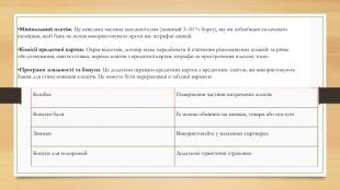 Кешбек. Повернення частини витрачених коштів. Бонусні балиЇх можна обміняти на знижки, товари або послуги. Знижки. Використовуйте у магазинах-партнерах. Бонуси для подорожей. Додаткові туристичні страховки. Мінімальний платіж. Це невелика частина загальної суми (зазвичай 3–10 % боргу), яку ви зобов’язані сплачувати щомісяця, щоб банк не почав використовувати проти вас штрафні санкції. Комісії кредитної картки. Окрім відсотків, договір може передбачати й стягнення різноманітних комісій: за річне обслуговування, зняття готівки, переказ коштів з кредитної картки, штрафи за прострочення платежу тощо. Програми лояльності та бонуси. Це додаткові переваги кредитних карток з кредитним лімітом, які використовують банки для стимулювання клієнтів. Це можуть бути перераховані в таблиці варіанти: