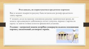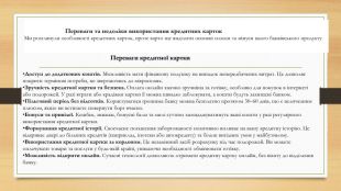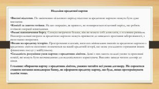 Недоліки кредитної картки. Високі відсотки. По закінченню пільгового періоду відсотки за кредитною карткою можуть бути дуже високими. Комісії за зняття готівки. На цю операцію, як правило, не поширюється пільговий період, що робить готівкові операції невигідними. Ризик накопичення боргу. Спокуса витрачати більше, ніж ви можете собі дозволити, є головним ризиком. Неконтрольовані витрати за кредитною карткою можуть призвести до швидкого зростання заборгованості, з якою важко впоратися. Вплив на кредитну історію. Прострочення платежів, несплата мінімальних внесків за кредитною карткою з кредитним лімітом негативно позначаться на вашій кредитній історії, що може ускладнити отримання інших фінансових послуг у майбутньому. Складність розуміння умов картки з кредитним лімітом. Деякі з них мають складні умови та приховані комісії, які можуть бути неочевидними для недосвідченого користувача. Важливо завжди читати договір до кінця.І головне: обираючи картку з кредитним лімітом, уважно читайте всі умови договору. Не соромтеся ставити питання менеджерам банку, як оформити кредитну картку, що буде, якщо протермінувати платіж тощо.