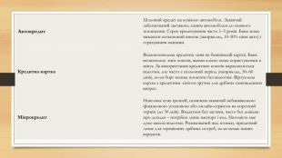Автокредит. Цільовий кредит на купівлю автомобіля.. Зазвичай забезпечений заставою, самим автомобілем до повного погашення. Строк кредитування часто 1–5 років. Банк може вимагати початковий внесок (наприклад, 10-30% ціни авто) і страхування машини. Кредитна картка. Відновлювальна кредитна лінія на банківській картці. Банк встановлює ліміт коштів, якими клієнт може користуватися в мінус. За використання кредитних коштів нараховуються відсотки, але часто є пільговий період (наприклад, 30–60 днів), коли борг можна погасити без відсотків. Віртуальна картка з кредитним лімітом зручна для дрібних повсякденних витрат. Мікрокредит. Невелика сума грошей, позичена зазвичай небанківською фінансовою установою або онлайн-сервісом на короткий термін (до 30 днів). Видається без застави, часто без довідки про доходи – потрібен лише паспорт і код. Натомість має дуже високі відсотки. Ризикований вид позики, придатний лише для термінових дрібних потреб, коли немає інших варіантів.