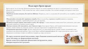 Коли варто брати кредит. Брати кредит чи ні, важливе фінансове рішення. Кредит не можна сприймати як просто додаткові гроші: це додаткове фінансове навантаження.. Тому позика має сенс лише в певних ситуаціях. Ось основні сценарії, коли кредит може бути виправданим: Необхідна велика покупка, без якої не обійтися. Наприклад, житло для родини або автомобіль, що потрібен для роботи чи бізнесу. Надзвичайна ситуація або термінова потреба. Якщо сталася біда, терміново потрібні кошти на лікування, дороговартісну операцію, терміновий ремонт даху, що протікає. Розвиток власної справи, інвестиція в освіту або кар’єру. У таких випадках позика може бути доцільною, адже деякі інвестиції потребують значних коштів одразу. Вигідна покупка або можливість, яка з’явилася зараз. Іноді кредит беруть, щоб скористатися вигідною нагодою: скажімо, значна знижка на товар або аукціон з продажу нерухомості за привабливою ціною. Покращення кредитної історії. Звучить парадоксально, але невеликий кредит, взятий і вчасно погашений, може підвищити ваш кредитний рейтинг. Іноді люди беруть дрібний швидкий кредит або товар в розстрочку, просто щоб сформувати позитивну історію на майбутнє (наприклад, перед іпотекою). Не варто позичати гроші імпульсивно, через бажання моментальної вигоди чи тиску обставин, не прорахувавши наслідки. Кредит може бути корисним фінансовим інструментом, якщо використовувати його розумно.