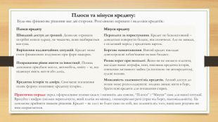 Плюси та мінуси кредиту: Будь-яке фінансове рішення має дві сторони. Розглянемо переваги і недоліки кредитів.: Плюси кредиту. Мінуси кредиту. Швидкий доступ до грошей. Дозволяє отримати потрібні кошти одразу, не чекаючи, поки назбирається вся сума. Переплата за користування. Кредит не безкоштовний – доведеться повернути більше, ніж позичили. Але не завжди, є пільговий період у кредитних карток. Вирішення надзвичайних ситуацій. Кредит може стати фінансовою подушкою при форс-мажорах. Боргове навантаження. Взятий кредит накладає довгострокові зобов’язання на ваш бюджет. Покращення рівня життя та інвестиції. Позика допомагає придбати житло, автомобіль, освіту – те, що підвищує якість життя або дохід. Ризик втрат при несплаті. Якщо ви не зможете платити, наслідки важкі: штрафи, пені, зіпсована кредитна історія, стягнення заставного майна (за іпотекою чи автокредитом), судові позови. Кредитна історія та довіра. Своєчасне погашення позик формує позитивну кредитну історію. . Можливість залежності від кредитів. Легкий доступ до позик може розхолоджувати: людина звикає жити в борг, брати нові кредити для погашення старих. Практична порада: перед оформленням позики сядьте і напишіть два списки, “Плюси” і “Мінуси” cаме для вашої ситуації. Врахуйте і цифри (скільки переплачуєте, який платіж на місяць), і нематеріальні речі (стрес від боргу, відповідальність). Це допоможе прийняти зважене рішення. Кредит – не зло і не благо само по собі, все залежить від того, наскільки розумно ви ним скористаєтеся.