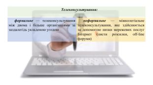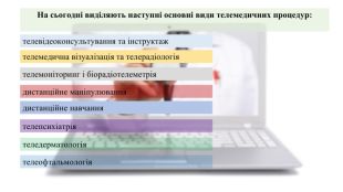 Надання телемедичної допомоги характеризується переважно двома ознаками :видом інформації, яку передають (опис історії хвороби, відеозображення ендоскопічної і УЗ-картини, рентгенівських знімків, мікроскопічних мазків, дані лабораторних аналізів);способом передачі інформації (телефонні лінії, супутниковий і стільниковий зв’язок).