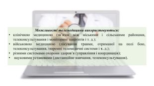 Можливості телемедицини використовуються:клінічною медициною (зв’язок між міськими і сільськими районами, телеконсультування і моніторинг пацієнтів і т. д.);військовою медициною (лікування травми, отриманої на полі бою, телеконсультування, тюремні телемедичні системи і т. д.);різними системами охорони здоров’я (управління і координація); науковими установами (дистанційне навчання, телеконсультування).