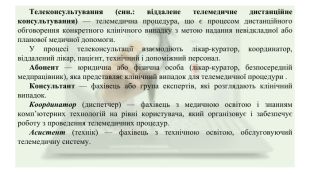 Телеконсультування (син.: віддалене телемедичне дистанційне консультування) — телемедична процедура, що є процесом дистанційного обговорення конкретного клінічного випадку з метою надання невідкладної або планової медичної допомоги. У процесі телеконсультації взаємодіють лікар-куратор, координатор, віддалений лікар, пацієнт, технічний і допоміжний персонал. Абонент — юридична або фізична особа (лікар-куратор, безпосередній медпрацівник), яка представляє клінічний випадок для телемедичної процедури . Консультант — фахівець або група експертів, які розглядають клінічний випадок. Координатор (диспетчер) — фахівець з медичною освітою і знанням комп’ютерних технологій на рівні користувача, який організовує і забезпечує роботу з проведення телемедичних процедур. Асистент (технік) — фахівець з технічною освітою, обслуговуючий телемедичну систему.