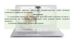 У сестринській практиці найчастіше використовується такий різновид телеконсультування, як інструктаж.Інструктаж :1) телемедична процедура забезпечення фізичної особи голосовим зв’язком з консультантом для отримання рекомендацій щодо надання першої медичної допомоги, 2) різновид синхронного телеконсультування .