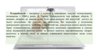 Телерадіологія - насправді є однією з найперших галузей телемедицини, починаючи з 1960-х років. В Україні телерадіологія теж набирає обертів. У менших лікарнях не завжди може бути лікар-радіолог або відсутній доступ до нього цілодобово. Це означає, що пацієнтам, які надходять у відділення невідкладної допомоги, особливо в неробочий час, доведеться чекати діагностики. Зараз телерадіологічні рішення пропонують медичним працівникам в одному місці відправляти рентген-знімки та записи пацієнта кваліфікованому лікарю-радіологу в іншому місці та швидко отримувати консультацію щодо стану пацієнта.