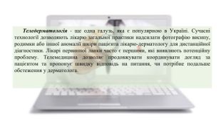 Теледерматологія - ще одна галузь, яка є популярною в Україні. Сучасні технології дозволяють лікарю загальної практики надсилати фотографію висипу, родимки або іншої аномалії шкіри пацієнта лікарю-дерматологу для дистанційної діагностики. Лікарі первинної ланки часто є першими, які виявляють потенційну проблему. Телемедицина дозволяє продовжувати координувати догляд за пацієнтом та пропонує швидку відповідь на питання, чи потрібне подальше обстеження у дерматолога.
