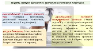 Існують наступні види систем дистанційного навчання в медицині:відеоконференції в режимі реального часу (телелекції, телесемінари, демонстрації операцій, маніпуляцій, пацієнтів, дискусії з аудиторією);ресурси Інтернету (тематичні сайти, електронні бібліотеки і бібліографічні бази даних, демонстрації і аналіз клінічних випадків, тематичні форуми, інтерактивні навчальні сервери);мультимедійні навчально-контролювальні системи (“медіа-педагоги”) — це програмно-апаратний комплекс, що включає ілюстровану навчальну інформацію і засоби контролю за її вивченням. Для технічної реалізації використовується як спеціально розроблене програмне забезпечення, так і широко доступні Інтернет-технології