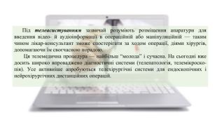 Під телеасистуванням зазвичай розуміють розміщення апаратури для введення відео- й аудіоінформації в операційній або маніпуляційній — таким чином лікар-консультант зможе спостерігати за ходом операції, діями хірургів, допомагаючи їм своєчасною порадою. Ця телемедична процедура — найбільш “молода” і сучасна. На сьогодні вже досить широко впроваджено діагностичні системи (телепатологія, телемікроско- пія). Усе активніше апробуються телехірургічні системи для ендоскопічних і нейрохірургічних дистанційних операцій.