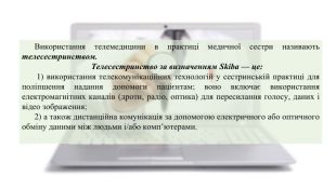 Використання телемедицини в практиці медичної сестри називають телесестринством. Телесестринство за визначенням Skiba — це: 1) використання телекомунікаційних технологій у сестринській практиці для поліпшення надання допомоги пацієнтам; воно включає використання електромагнітних каналів (дроти, радіо, оптика) для пересилання голосу, даних і відео зображення; 2) а також дистанційна комунікація за допомогою електричного або оптичного обміну даними між людьми і/або комп’ютерами.