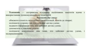 Телехоспіс — сестринська підтримка паліативних пацієнтів вдома з використанням телекомунікаційних технологій. Телехоспіс дає змогу:обмежити кількість непотрібних госпіталізацій, візитів до лікарні;поліпшити супровід тих, хто здійснює догляд удома;надавати інформацію тим, хто здійснює догляд удома;допомагати в ухваленні рішень;поліпшити комунікацію між тими, хто здійснює догляд удома, і медпрацівниками.