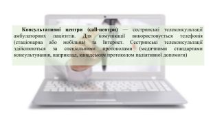 Консультативні центри (call-центри) — сестринські телеконсультації амбулаторних пацієнтів. Для комунікації використовується телефонія (стаціонарна або мобільна) та Інтернет. Сестринські телеконсультації здійснюються за спеціальними протоколами (медичними стандартами консультування, наприклад, канадським протоколом паліативної допомоги)