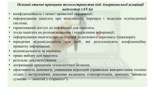 Основні етичні принципи телесестринства (від Американської асоціації медсестер (ANA))конфіденційність і захист приватної інформації;інформування пацієнта про можливості, переваги і недоліки телемедичної системи;гарантований доступ до інформації для пацієнта;згода пацієнта на розповсюдження і пересилання інформації;інформування пацієнта про залучення додаткового персоналу (інженери);юридична відповідальність для осіб, які розголошують конфіденційну приватну інформацію;відповідальність за пацієнта;право вибору для пацієнта;ретельне документування;дотримання принципів технологічної безпеки;ефективність допомоги, уникнення ятрогеній (правильне використання техніки згідно з інструкціями, доказова медицина, стандартизація, принцип “виникли сумніви — запитай у старшого”).