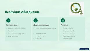Рекомендована для учнів 8 класу при вивченні теми "Добування кисню" в лабораторних умовах як адаптована інструкція з покроковим описом дій навчального дослідження.