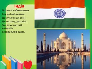 Індія. Проте часу обмаль маємІ ми до Індії рушаєм,Де сплелися дві ріки –Дві сестриці, два світи. Там лотос цвіт свій розкриваєЄвропу й Азію єднає.