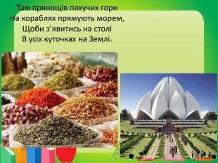 Там прянощів пахучих гори. На кораблях прямують морем,Щоби з’явитись на століВ усіх куточках на Землі.