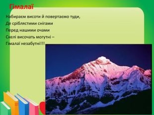 ГімалаїНабираєм висоти й повертаємо туди,Де сріблястими снігами. Перед нашими очами. Скелі височать могутні – Гімалаї незабутні!!!