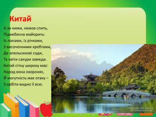 Китай. А за ними, немов спить,Піднебесна майорить:Із ланами, із річками,З височенними хребтами,Де апельсинові сади,Та квіти сакури завжди. Китай стіну широку має: Народ вона охороняє,Й могутність має отаку – З орбіти видно її всю.