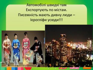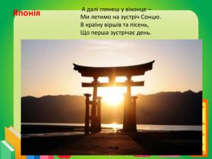 Японія А далі глянеш у віконце – Ми летимо на зустріч Сонцю. В країну віршів та пісень,Що перша зустрічає день.