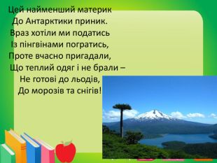 Цей найменший материк. До Антарктики приник. Враз хотіли ми податисьІз пінгвінами погратись,Проте вчасно пригадали, Що теплий одяг і не брали – Не готові до льодів,До морозів та снігів!
