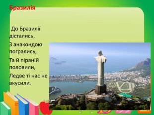 Бразилія До Бразилії дістались,З анакондою погрались,Та й піраній половили,Ледве ті нас не вкусили.