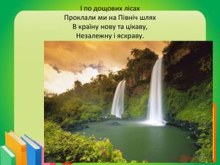 І по дощових лісах. Проклали ми на Північ шлях. В країну нову та цікаву,Незалежну і яскраву.