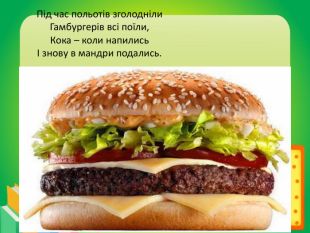 Під час польотів зголодніли. Гамбургерів всі поїли,Кока – коли напилисьІ знову в мандри подались.