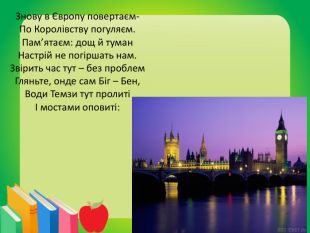 Знову в Європу повертаєм-По Королівству погуляєм. Пам’ятаєм: дощ й туман. Настрій не погіршать нам. Звірить час тут – без проблем. Гляньте, онде сам Біг – Бен,Води Темзи тут пролитіІ мостами оповиті: