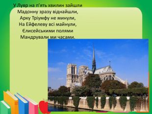 У Лувр на п’ять хвилин зайшли. Мадонну зразу віднайшли,Арку Тріумфу не минули,На Ейфелеву всі майнули,Єлисейськими полями. Мандрували ми часами.