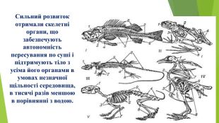 Сильний розвиток отримали скелетні органи, що забезпечують автономність пересування по суші і підтримують тіло з усіма його органами в умовах незначної щільності середовища, в тисячі разів меншою в порівнянні з водою.